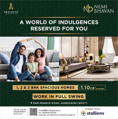 Nemi Bhavan is a Residential Project Developed by the Neminath Group. It is located at Goregaon West. Goregaon West is well-connected to other parts of Mumbai through the Western Express Highway. The Goregaon railway station, located on the Mumbai suburban railway network, is a significant transportation hub in the area. 1 minute from Ram Mandir Station. Well connected to the social infrastructure. It is a 28 storey tower which offers 1,2 and 3 BHK Residences. Rooftop amenities include performance stage, star gazing deck, bbq centre and many more.