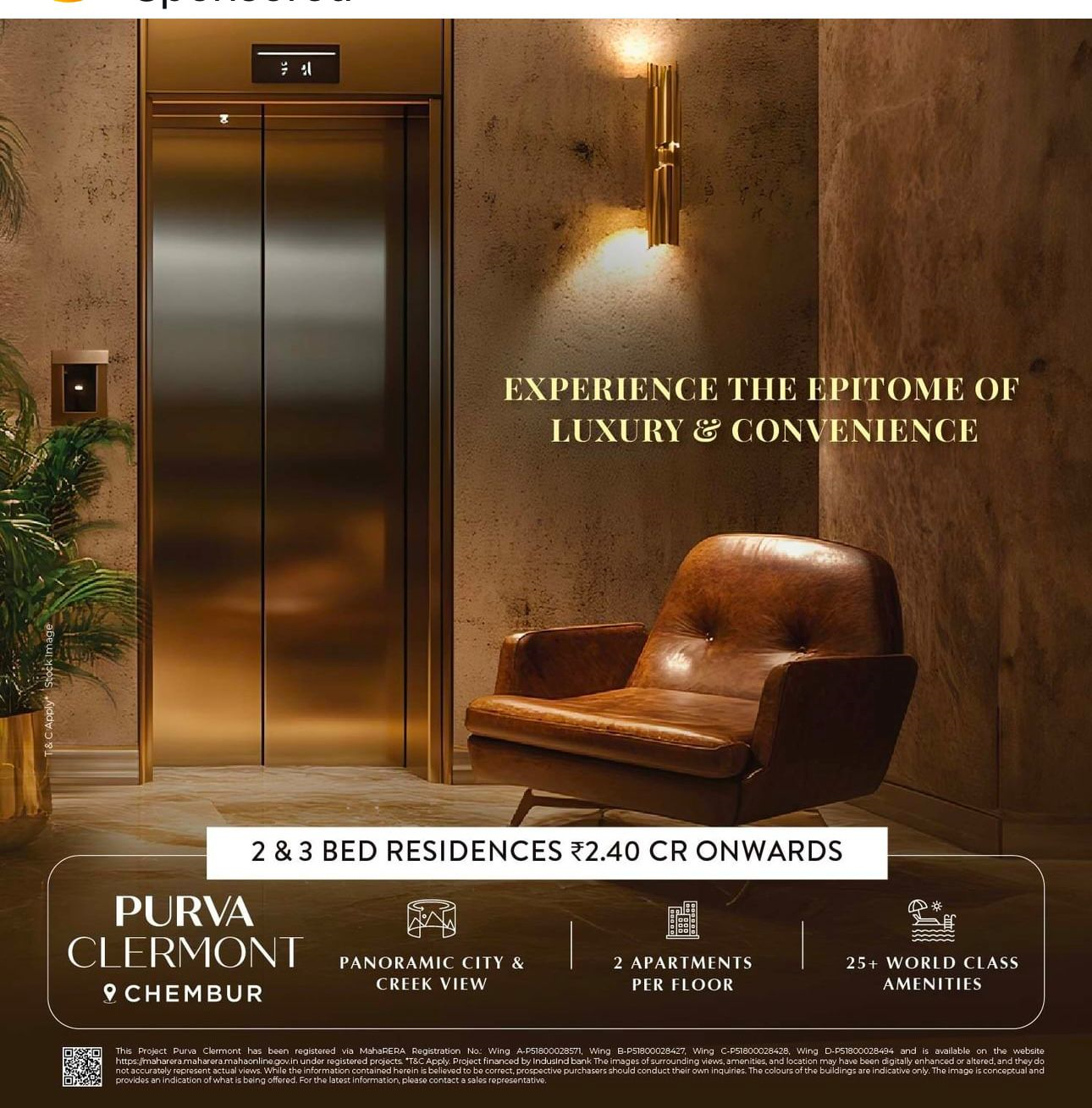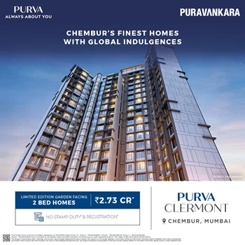 Purva Clermont is a Residential Project by Puravankara Ltd. It is a 18 storey tower located at Chembur. 2 minutes from Eastern Express Highway. Eastern Freeway – 6 mins, BKC – 20 mins, Western Express Highway – 25 mins, Vashi – 30 mins. Shivaji Chowk Metro Station (Metro Line 2B): 2-3 mins providing easy access to western suburbs & South Mumbai. 2, 3 & 4 Bed Residences with 30+ Lifestyle Amenities. A Gated Branded Residential development. World Home Collections. State of the Art - Blunex Technology - complete Home Automation partnered with Google. Oxygenated Club-House to relax and rejuvenate. Rejuvenate with 30+ Lifestyle Amenities Hammock zone -Barbecue deck -zip lining -reflexology path -pet zone -multi purpose court -Swimming Pool -amphitheater -zen deck -aroma garden -Gym, Kid’s Play Area, Rooftop Jogging track, Leisure Lawns & a lot more.