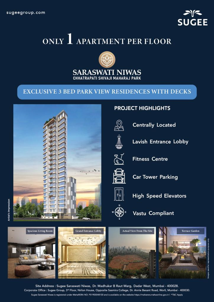 Saraswati Niwas is a Residential Project Developed by the Sugee Group. It is located at Dadar West. Dadar West enjoys excellent connectivity to various parts of Mumbai. It is well-connected by road and rail networks, with the Dadar railway station serving as a major transit point for both local and long-distance trains. Centrally located, BKC-20 min., Worli Sea Face-15 Min., Lower Parel- 12 min. All reputed social infrastructure within 10-15 min. driving distance. It is a G+20 storey standalone tower offering 3 BHK Vaastu compliant residences. The Apartments comes with balcony. Dedicated one spacious apartment each floor. Dedicated drop-off lobby & exclusive entrance lobby with security access. Well designed Large size master bedrooms for mindful living. Amenities include Fitness center, Car parking tower, Terrace garden with sit out areas, Automated Tower car parking System.